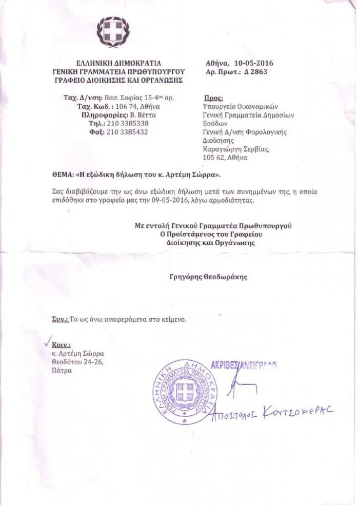 Η ΑΠΑΝΤΗΣΗ ΠΟΥ ΕΛΑΒΕ Ο ΠΡΟΕΔΡΟΣ ΤΟΥ ΠΟΛΙΤΙΚΟΥ ΦΟΡΕΑ ΕΛΛΗΝΩΝ ΣΥΝΕΛΕΥΣΙΣ Ε.ΣΥ - ΤΟΥ ΕΘΝΟΥΣ #ΑΡΤΕΜΗΣ_ΣΩΡΡΑΣ ΜΙΑ ΗΜΕΡΑ ΜΕΤΑ ΤΗΝ ΕΞΩΔΙΚΗ "ΔΙΑΤΑΓΗ" ΚΡΑΤΙΚΗΣ ΕΞΟΥΣΙΑΣ ΠΡΟΣ ΤΟΝ ΑΛΕΞΗ ΤΣΙΠΡΑ ΣΤΙΣ 9 ΜΑΙΟΥ ΤΟΥ 2016 ΑΠΟ ΤΟ ΠΡΩΘΥΠΟΥΡΓΙΚΟ ΓΡΑΦΕΙΟ