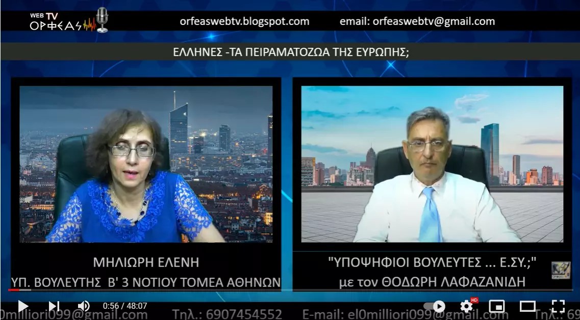 Η Ελένη Μηλιώρη, υποψήφια βουλευτής της ΕΛΛΗΝΩΝ ΣΥΝΕΛΕΥΣΙΣ, στην εκπομπή «ΥΠΟΨΗΦΙΟΙ ΒΟΥΛΕΥΤΕΣ … Ε.ΣΥ.;», με τον Θεόδωρο Λαφαζανίδη.